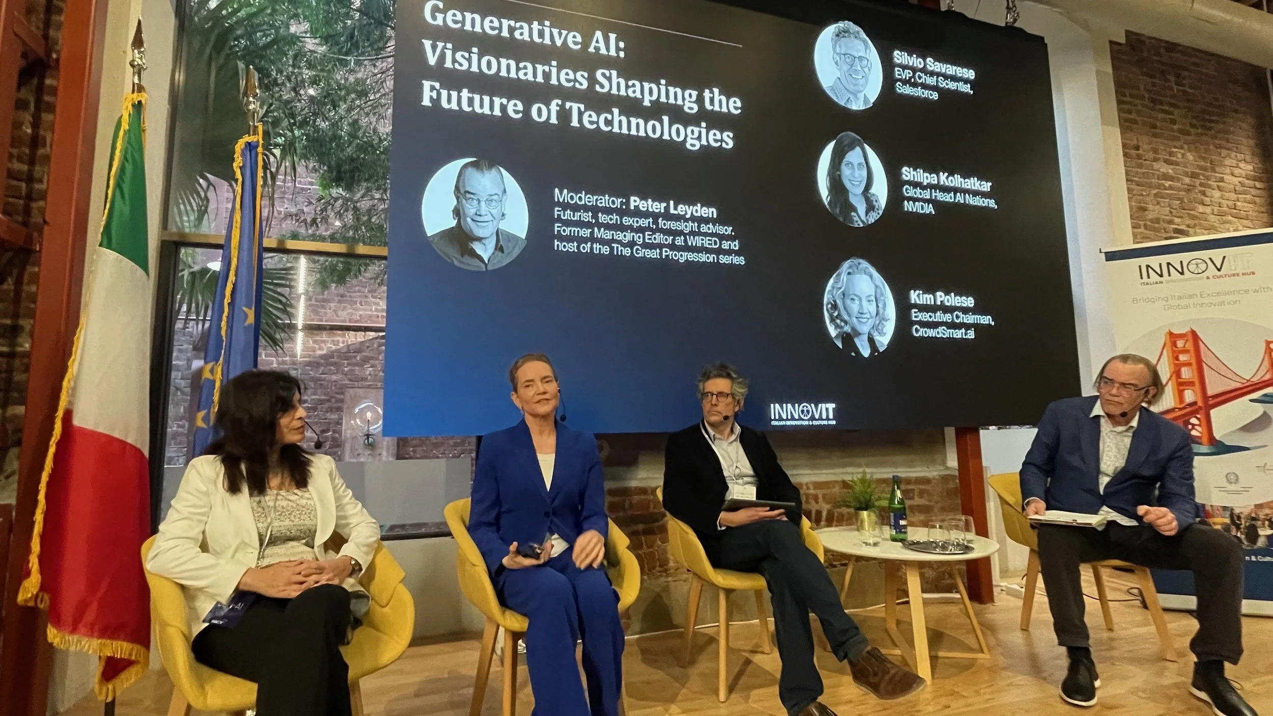 In recent years he has helped visiting delegations of senior leaders from other countries make the most of their relatively short visits. In the last couple years with the explosion of AI, Leyden has anchored sessions with visitors from Norway, Sweden, Mexico, Asia, and quite a few delegations from Italy (see the adjacent photo with the Italian flag).